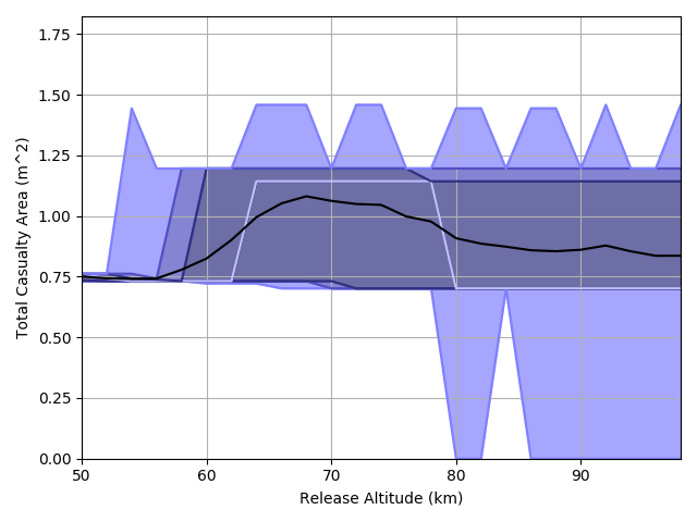 Profile of the total casualty area of resulting from all fragments as a function of release altitude.